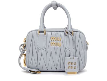Miu Miu's Arcadie matelassé nappa leather bag is a chic and versatile accessory. Crafted from chevron quilted leather, it features leather handles, a thin strap, and gold metal finishes. The metallic logo on the front adds a touch of luxury, while the zipper closure ensures your belongings are secure. This bag can be hand carried, worn on the shoulder, or crossbody for effortless style.