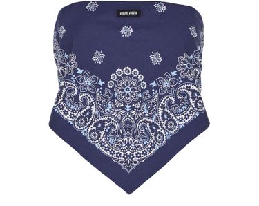 Discover Miu Miu's Bandana bustier, a sleeveless crop top adorned with a mesmerizing floral print and paisley pattern. The decorative label with the "Miu Miu" logo adds a touch of elegance, while the bow fastening completes the stylish silhouette, perfect for pairing with high-waisted trousers or skirts.