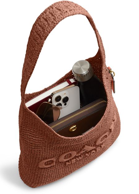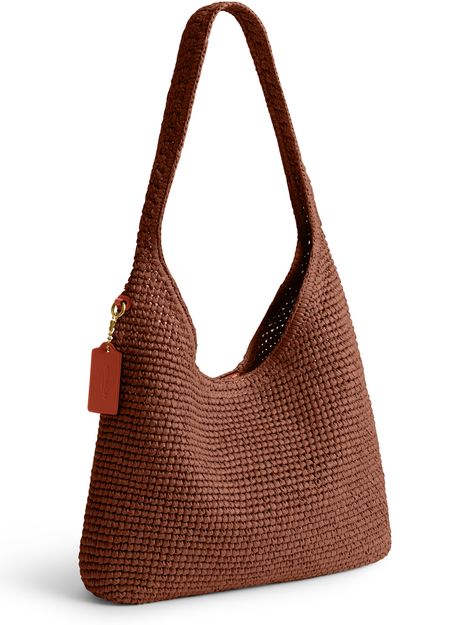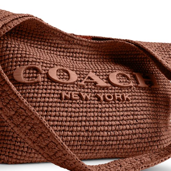 Reveal Coach's shoulder bag, a modern statement with a decorative label featuring the embossed Coach logo. The single handle and wide strap offer versatile carrying options, while the zipper closure and metal finish add a refined touch. A front embossed logo completes this sleek, functional accessory.