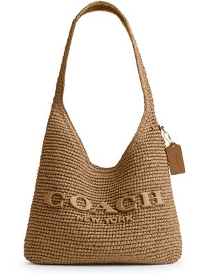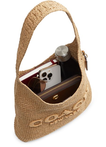 Reveal Coach's hobo shoulder bag, designed with a single handle and a wide strap for versatile wear. The spacious interior compartment, secure zipper closure, and front embossed logo combine with gold metal finishes to create a refined accessory that effortlessly elevates any ensemble.