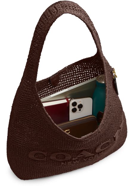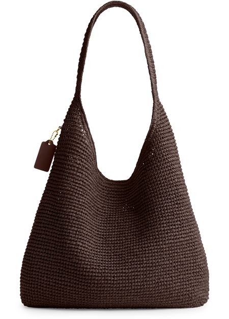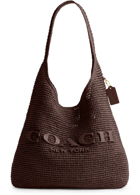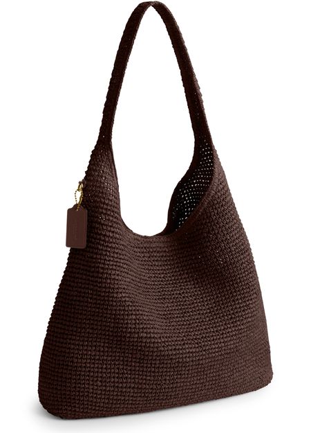 Reveal Coach's open weave hobo bag, where a decorative label with an embossed Coach logo meets a single handle and gold-finish hardware. The magnetic closure and large interior compartment offer both style and practicality, while visible stitching adds a refined touch to this modern shoulder essential.