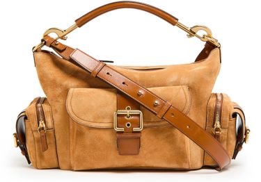 Chloé's Camera bag showcases a sleek silhouette with a gold finish and an engraved logo. Its single compartment features interior patch pockets for organization, while external pockets add functionality. The bag can be hand carried or worn crossbody, complete with a thin strap and double handles, accented by visible topstitching.