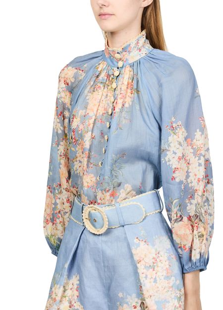 Reveal Zimmermann's Cascadian Billow blouse. This exquisite floral print top features elegant puff sleeves and a sophisticated front buttoned closure. Perfect for any occasion, its long-sleeved design ensures a graceful silhouette. Style it effortlessly with tailored trousers or a chic skirt.