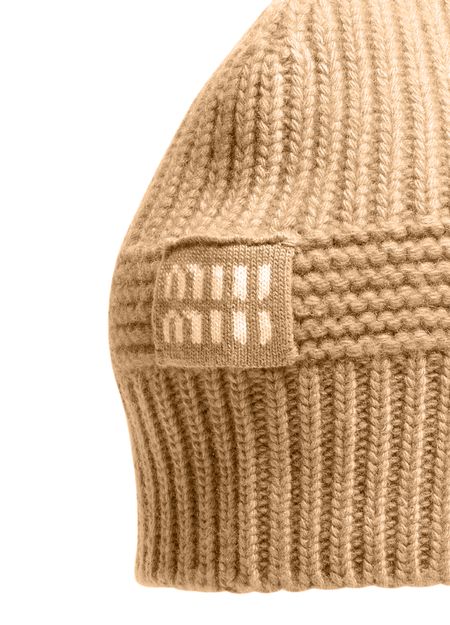 Reveal Miu Miu's Cashmere and wool beanie, crafted in warm, stretchable fabric for versatile styling. Featuring a prominent front logo, this accessory combines elegance and comfort, offering a cozy touch to any outfit.