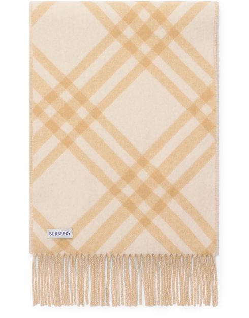 A scarf in double-faced cashmere, woven with a seasonal check at a Scottish mill founded in 1797. The fabric is washed in local spring water and receives an additional wash for an ultra-soft finish and raised nap