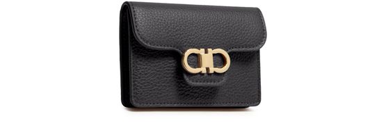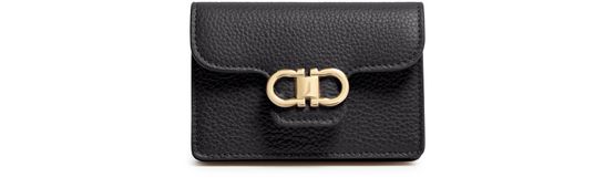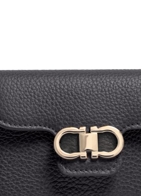 Unveil Ferragamo's Gancini key holder, crafted from exquisite grained leather. This wallet features a magnetic closure, ensuring your essentials are secure. Its visible topstitching and front logo, complemented by a sophisticated gold finish, highlight the brand's impeccable craftsmanship.