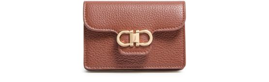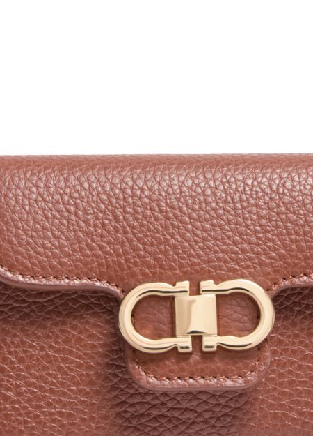 Unveil Ferragamo's Gancini key holder, crafted from exquisite grained leather. This wallet features a magnetic closure, ensuring your essentials are secure. Its visible topstitching and front logo, complemented by a sophisticated gold finish, highlight the brand's impeccable craftsmanship.