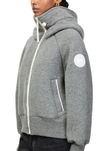 Reveal Canada Goose's Chilliwack fleece aviator jacket, a short bomber silhouette crafted from warm fabric. The long sleeves and zipper closure offer comfort, while side pockets add practicality. Distinctive details and signature branding elevate its versatile appeal, making it perfect for both relaxed and refined looks.