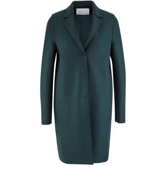 Harris Wharf features refined lines on this cocoon wool coat. The London-based brand is well-known for its coats and blazers in impeccable cuts and bright colors. This piece is offered in multiple deep colors and displays a notched lapel collar and three invisible buttons. Wear this model over a funnel neck sweater and neutral slim-fit pants to let its contrasting color shine through.