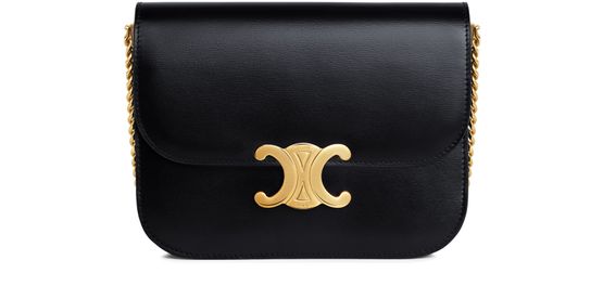 Celine's College Triomphe bag in shiny calfskin is a stunning blend of elegance and functionality. With its iconic Triomphe magnetic closure, it features two main compartments, an inner zipped pocket, and a central flat pocket. Perfect for cross-body or shoulder carry, the chain adds a touch of sophistication to any ensemble.