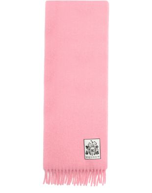 Unveil Alexander McQueen's cosy solid scarf, an essential accessory featuring a front logo and exquisite fringe details, perfect for adding a touch of modern elegance to any ensemble.