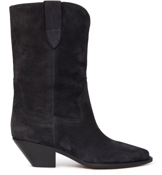 Isabel Marant's Dahope boots showcase a stylish high-top upper with a pointed toe and laminated Cuban heels. Visible stitching adds a touch of craftsmanship, while the closed design ensures a sleek silhouette. Perfect for elevating any outfit, these boots blend comfort and elegance effortlessly, making every step a statement.