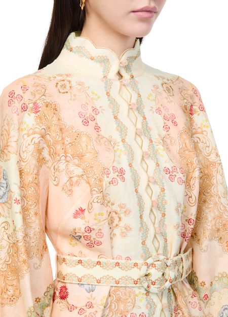Reveal Zimmermann's Daylight mini dress, a captivating floral print piece with a high-neck and long, cuffed sleeves. Embroidered details and scalloped edges add refined texture, while the back zipper closure ensures a sleek fit. Perfect for elevating your look at any daytime event.