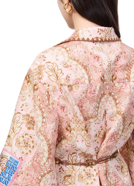 Reveal Zimmermann's Daylight mini tunic dress, a captivating mini dress adorned with a paisley pattern. The tailored collar and three-quarter bell sleeves create a refined silhouette, while scalloped edges add a playful finish. Perfect for elevating your day-to-evening style with effortless sophistication.