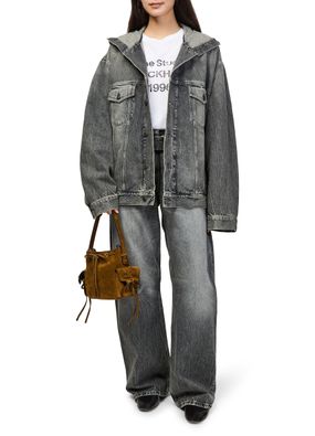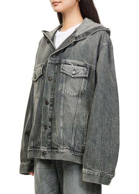 Reveal Acne Studios's denim jacket, a cropped trucker silhouette crafted from faded denim. Button fastening, long sleeves, and two breast patch pockets combine with topstitched edges and a subtle patch detail. This lined piece offers versatile styling, seamlessly transitioning from casual outings to elevated ensembles.