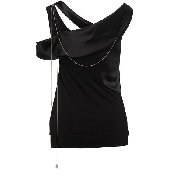 The Loewe Draped Top is a stylish sleeveless top with a draped neck design and wide straps. It features a bi-material construction with visible stitching, adding a touch of uniqueness to the piece. This versatile top can be effortlessly paired with various bottoms for a chic and fashionable look.