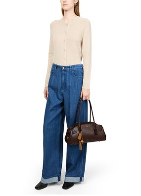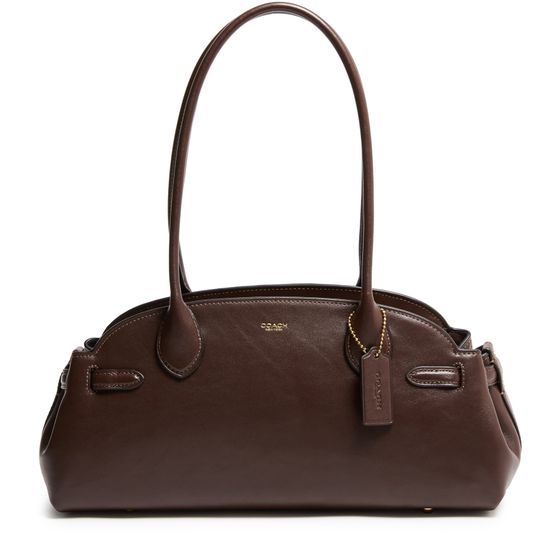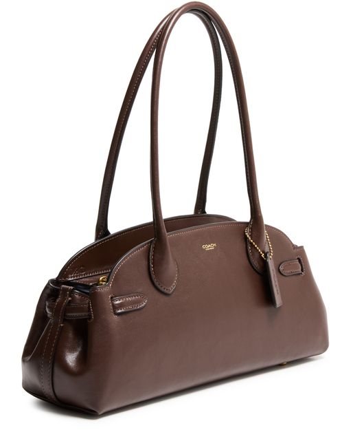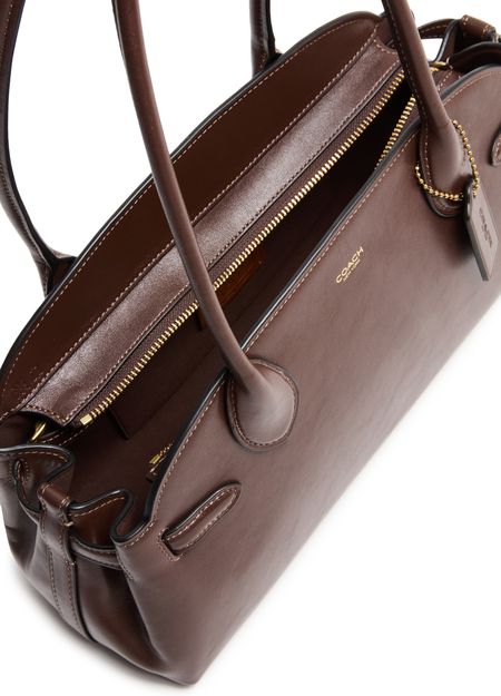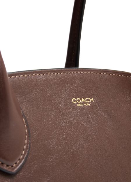 Introducing Coach's Empire carryall 34 glazed leather shoulder bag, a masterpiece of elegance and functionality. Crafted from smooth leather, it features a decorative label with an embossed "Coach" logo. The double handles and zipper closure ensure practicality, while the gold finish adds a touch of sophistication.
