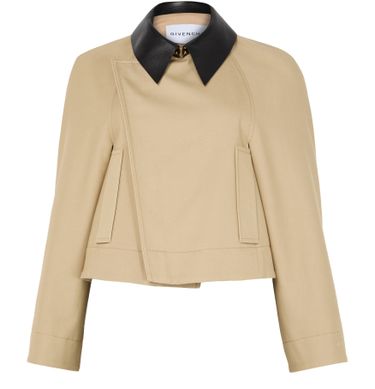 Reveal Givenchy's cropped pea oat in cotton and wool. This boxy fit and short-length coat features a collar neckline in leather and long sleeves, complete with welt pockets for a sleek finish. Its timeless design ensures versatility, making it perfect for both casual and elegant settings.