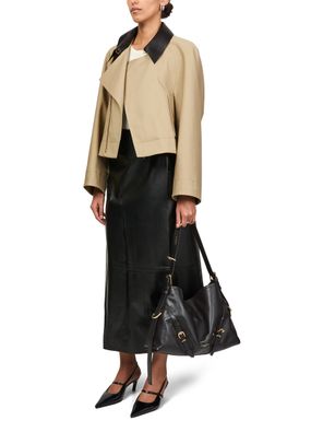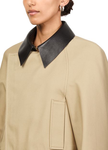 • Description : Cropped fit, a-line jacket, leather collar, zipped closure, notched collar, long-sleeved, welt pockets.