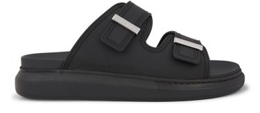 These flat sandals by Alexander McQueen feature wide buckled straps with silver finishes. The logo-printed insole provides comfort and style, while the embossed logo adds a trendy touch. Perfect for casual or dressy outfits, these chic sandals are a must-have for any fashion-forward wardrobe.