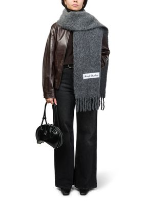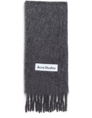 Reveal Acne Studios's fringed wool scarf, a statement accessory defined by its soft texture and distinctive fringed edges. The front logo adds a modern touch, while the printed detail ensures a signature finish. Perfect for elevating any look with refined sophistication.