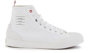 These high-top canvas trainers are modern and distinguished. The designer Thom Browne traces the tricolour stripe from the back to the lace eyelets, which are adorned with the famous red, white and blue.