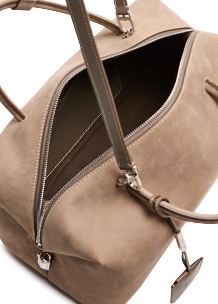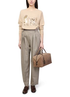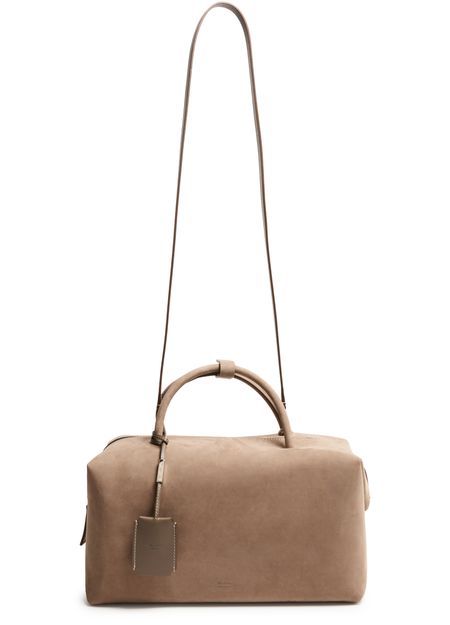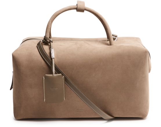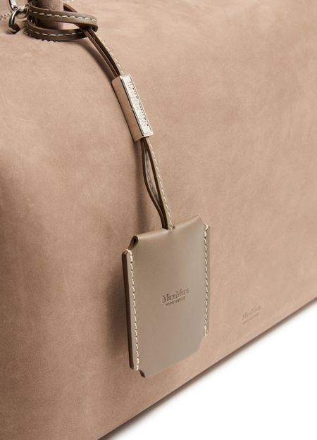 Reveal Max Mara's suede shoulder bag, crafted with double handles and a thin, adjustable strap for versatile wear. The front embossed logo and silver finish add a refined touch, while the spacious interior and secure zipper closure ensure both style and practicality for your daily essentials.
