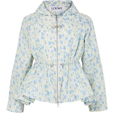 Introducing Loewe's hooded jacket in silk, a masterpiece of modern style. This regular-fit, short-length jacket features a vibrant floral print and a practical zipper closure. The long sleeves and hood offer comfort while the silk material adds a touch of elegance, perfect for versatile styling.