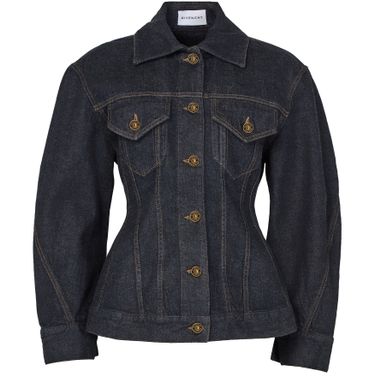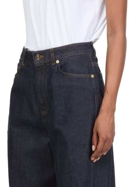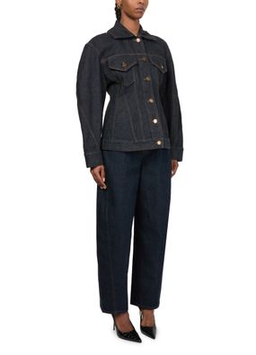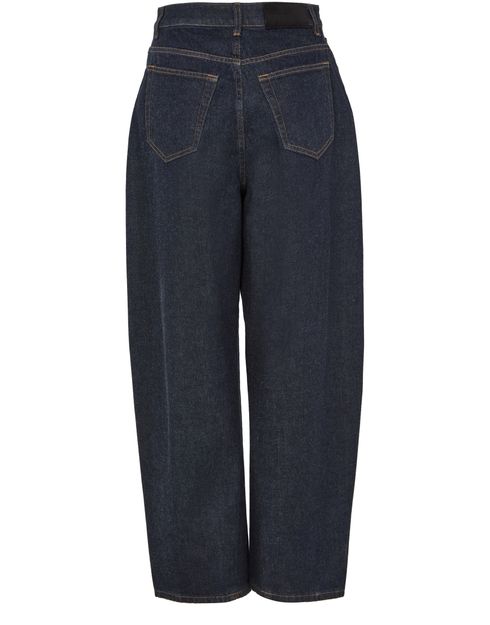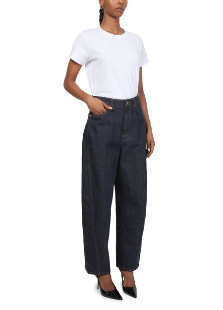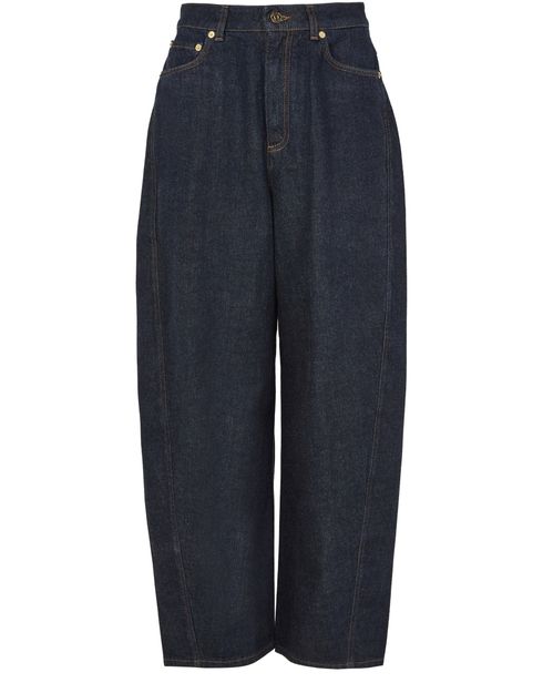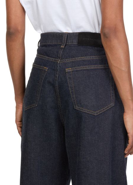 Unveil Givenchy's Cocoon jeans in raw denim, designed with ankle-length precision and a buttoned zipper closure. The pants boast two front pockets and a back patch pocket, accented by visible stitching and belt loops. A back leather logo adds a distinctive touch, perfect for versatile styling.