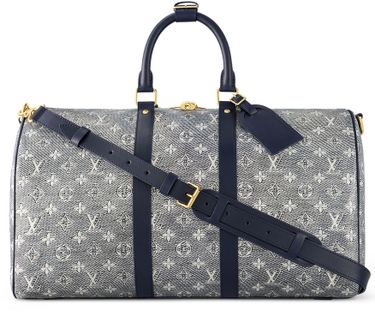 The Keepall Bandoulière 45 is fashioned from Monoglam canvas, a mix of lurex and cotton. The canvas is coated with a semi-reflective finish, giving it an almost holographic feel. The bold navy-blue leather lateral bands and top handles, removable name tag, and detachable shoulder strap structure the bag’s lines.
