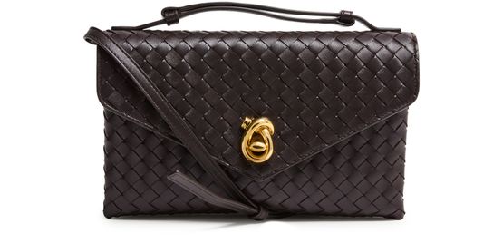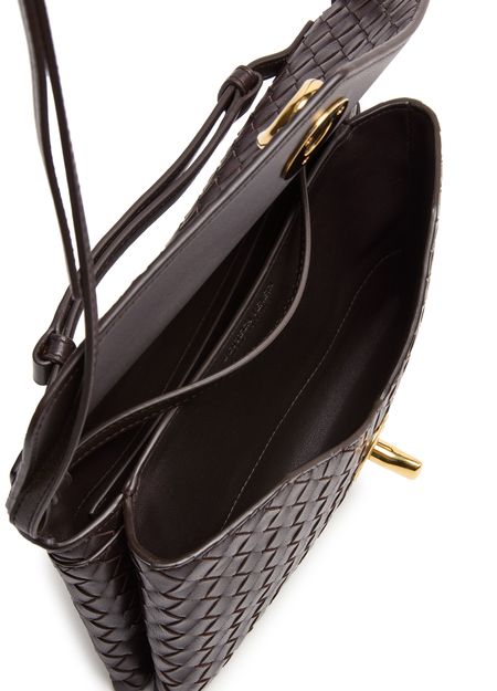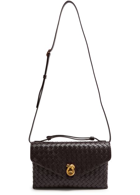 Reveal Bottega Veneta's crossbody bag, a testament to refined artistry with its signature Intrecciato weaving technique. The sleek single handle and thin strap offer versatile carrying, while the flap closure and gold finish add a polished touch. Experience functional elegance with a discreet back pocket and leather interior.