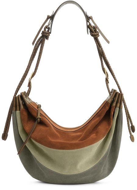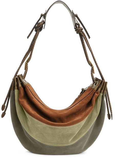 • Description : Shoulder bag, single handle, leather handle, suede, zipper closure, visible topstitching, metal finish.