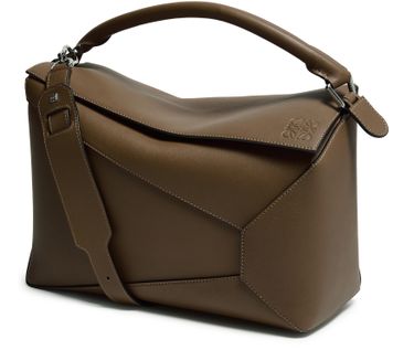 Unveil Loewe's Large Puzzle bag in grained calfskin, designed with both style and functionality in mind. The embossed logo and anagram medallion highlight exquisite craftsmanship. Featuring an adjustable, detachable strap, zippered front pocket, and visible topstitching, this bag seamlessly transitions from shoulder to crossbody wear.