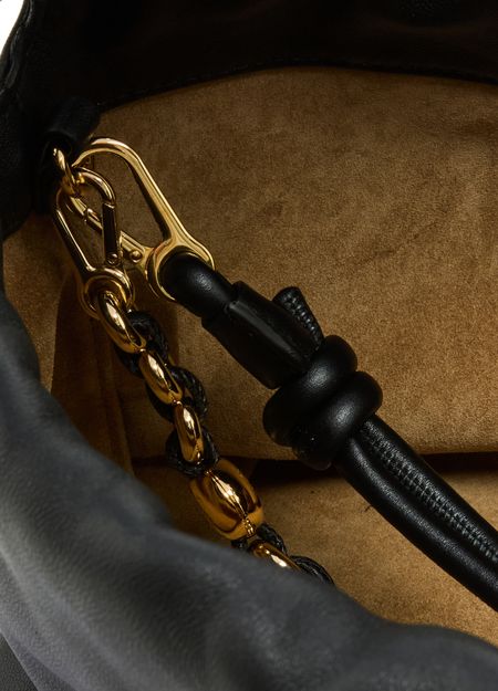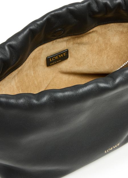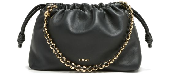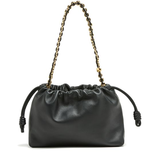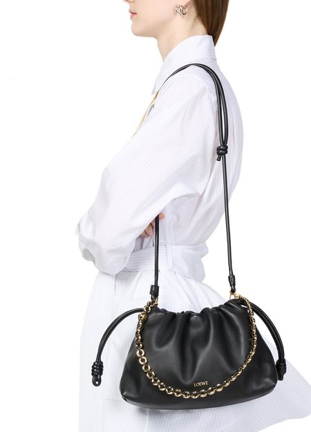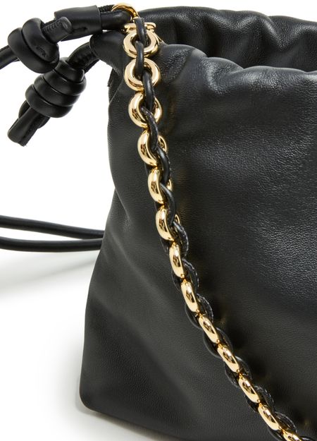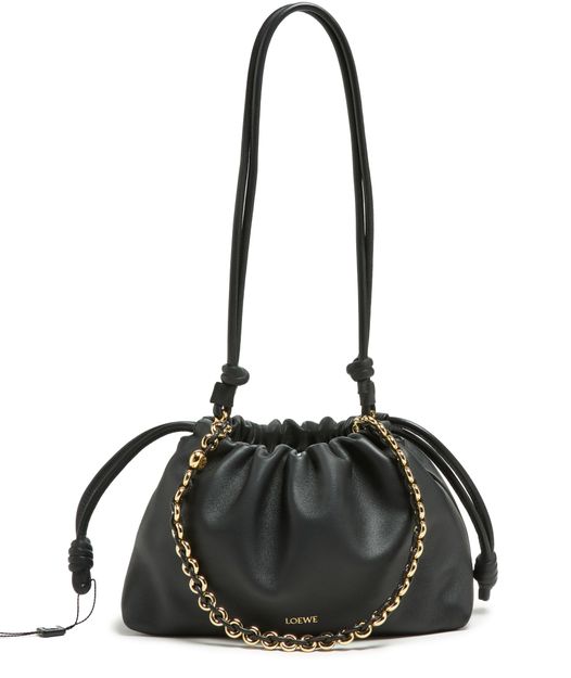 Loewe's Leather Flamenco Purse is a hand carried small bucket bag with a thin strap and single handle. It has a drawstring closure and magnetic closure for security. The single compartment is adorned with an appliquéd logo and gold letters. The front logo is printed for a sleek finish.