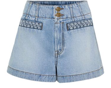 • Description : back pocket, patch pockets, welt pockets, buttoned and concealed zipper closure, visible stitching, low-waist fit, belt loops, short length, belted waist.