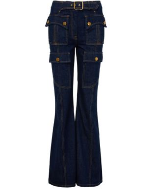 Reveal Zimmermann's Luna Utility flared jeans, crafted with ankle-length precision and defined by topstitched edges and patch details. The front and back paneling, along with flap and patch pockets, offer both style and function. Visible contrast stitching completes this modern silhouette for versatile, elevated dressing.