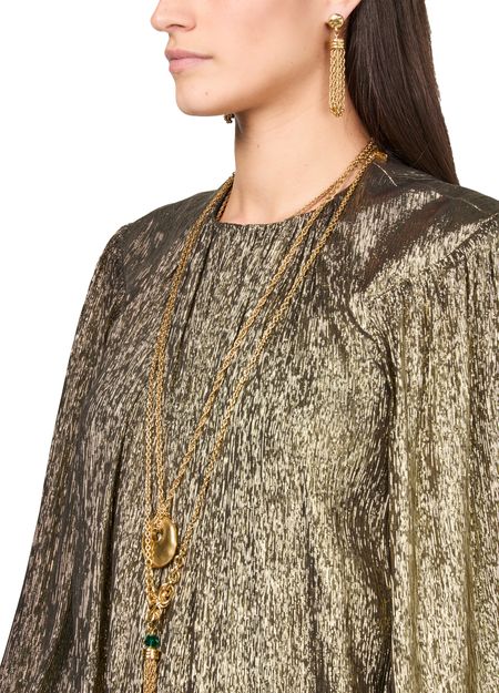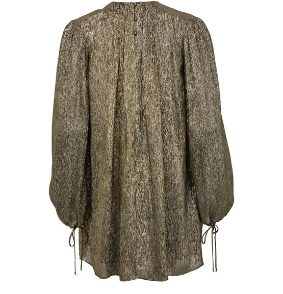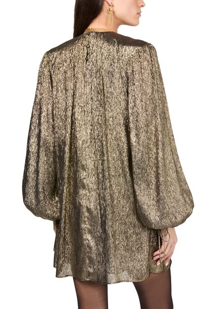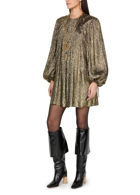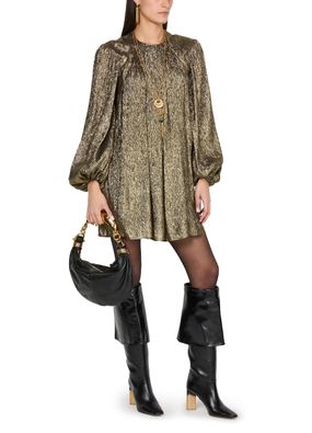 Chloé's Metallic mini dress showcases a long tunic silhouette with a crew neck and long sleeves, perfect for stylish layering. Its back buttoned fastening adds a unique touch, while the visible stitching highlights the craftsmanship. This dress effortlessly combines elegance and modernity, making it a standout piece for any occasion.