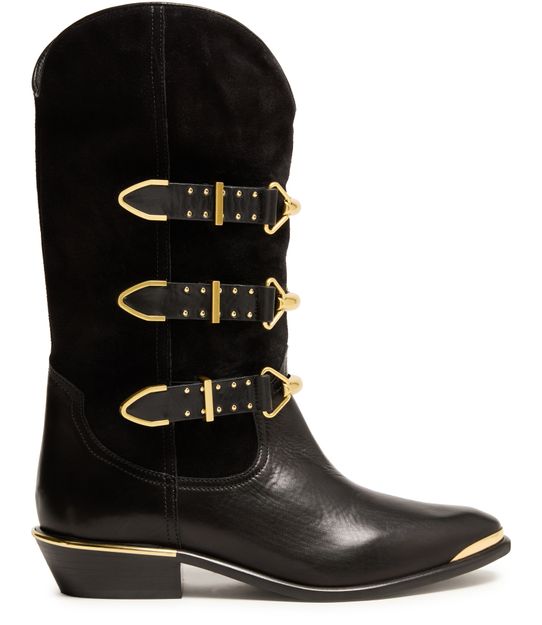 Unveil Isabel Marant's Mexia cowboy boots, crafted from smooth leather with a low block heel. These boots feature a pointed toe and buckled strap closure, enhanced by visible stitching and studded details. The gold finish and wide straps add a touch of elegance, making them a standout choice.