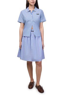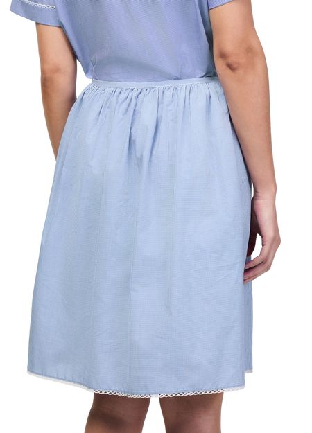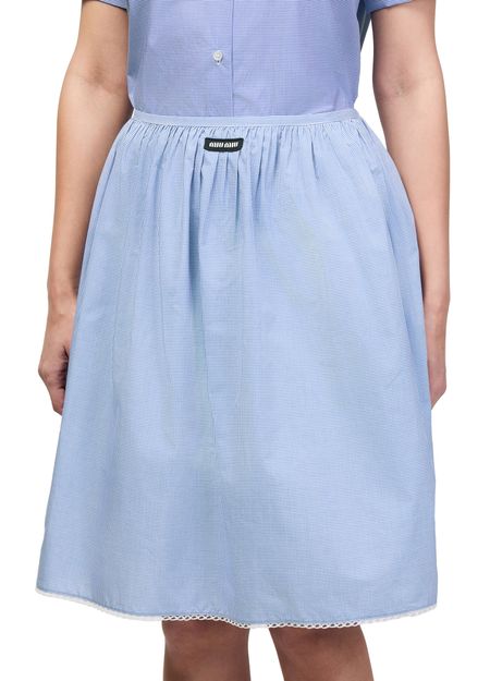 Reveal Miu Miu's checkered midi skirt, featuring a knee-length silhouette with an elasticated waist for effortless comfort. The gathered waist and front logo detail add a refined touch, while the decorative label with the Miu Miu logo ensures a signature finish. Perfect for versatile styling from day to evening.