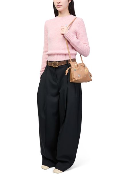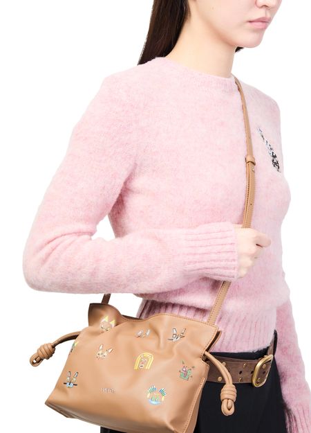 The Flamenco clutch is a soft and slouchy bag with a cinched closure and historical knot drawstrings. This mini version is crafted in nappa calfskin with allover 3D-effect cat prints.