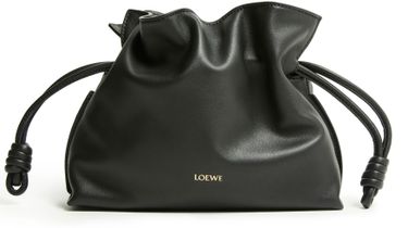 Loewe's Mini Flamenco clutch features a front logo in silver letters and a drawstring closure. It can be hand carried with its thin strap or worn on the shoulder or crossbody with the detachable strap. This versatile bag is perfect for adding a touch of elegance to any outfit.