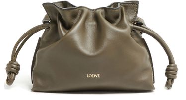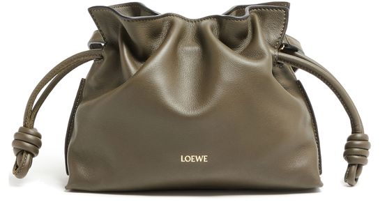 Loewe's Mini Flamenco clutch features a front logo in silver letters and a drawstring closure. It can be hand carried with its thin strap or worn on the shoulder or crossbody with the detachable strap. This versatile bag is perfect for adding a touch of elegance to any outfit.