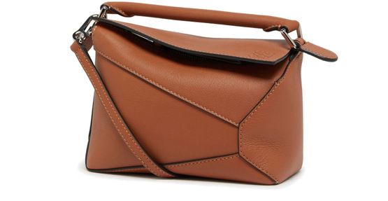 Loewe's Mini Puzzle Bag is a versatile mini bag with a handle and detachable strap for multiple styling options. It features a flap closure and embossed logo for a chic touch. This compact bag can be worn in the hand or on the shoulder, making it perfect for everyday use.
