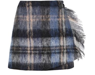 • Description : Checked pattern, mini length, asymmetric skirt, fringe details, wrap skirt.