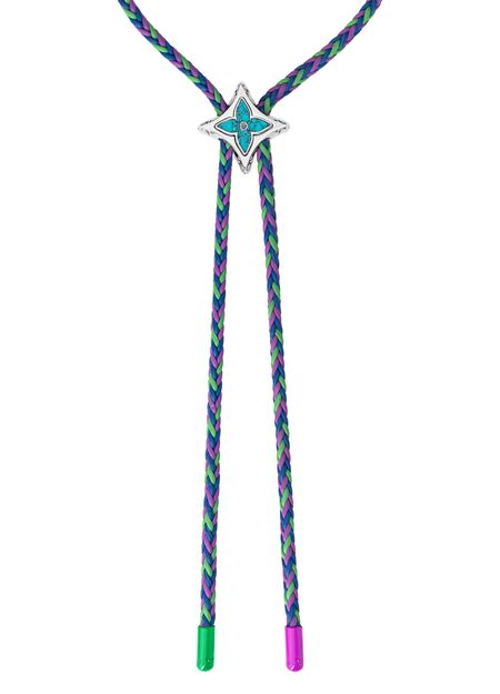 The MNG Big Party Necklace features a braided leather rope in contrasting colours, fastened by a Monogram Flower stopper for a contemporary aesthetic. A stone-effect resin accent and Monogram engraving create an elegant touch. Bright tips, one in a shiny varnish and the other adorned with crystals, complete this vibrant piece.