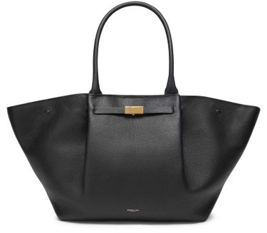 Introducing Demellier's The New York handbag, a refined shopper bag crafted with a magnetic closure and a single compartment for effortless organization. Its gold finish, double handles, and front logo exude sophisticated flair, while the zippered interior pocket and thin strap provide versatile carrying options.