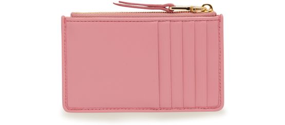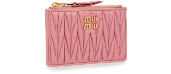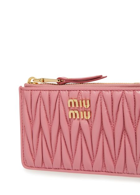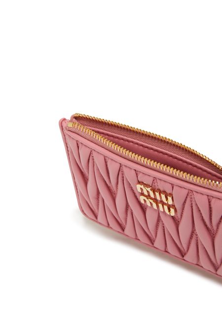 Miu Miu's Padded zipped card holder features a sleek design with slots for bank cards. Made from chevron quilted leather, it is both stylish and functional. The metallic logo on the front adds a touch of sophistication to this compact and practical accessory.
