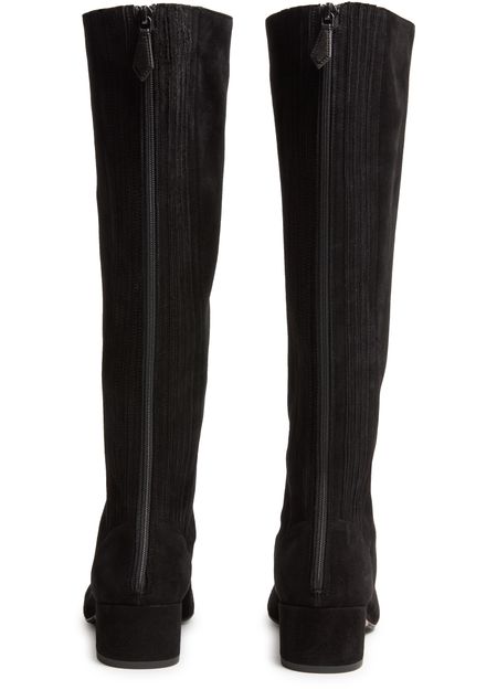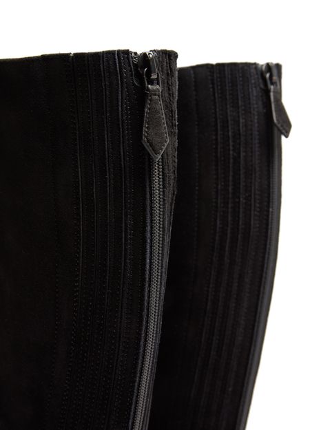• Description : Boots, suede, block heel, low heel, closed, square toe, back zipper, visible stitching, zip details.