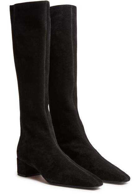 Reveal Aquazzura's suede boots, featuring a chic square toe and a convenient back zipper. The low block heel ensures comfort, while visible stitching adds a touch of sophistication. Perfect for any occasion, these boots are a stylish addition to your wardrobe.