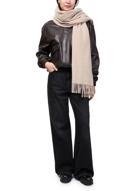 Acne's Oversized scarf showcases a unique design with fringe details that add a playful touch. Its appliquéd logo subtly enhances the style, while the fringed edges create a relaxed, bohemian vibe. Perfect for layering, this scarf effortlessly elevates any outfit, making it a must-have accessory for fashion enthusiasts.